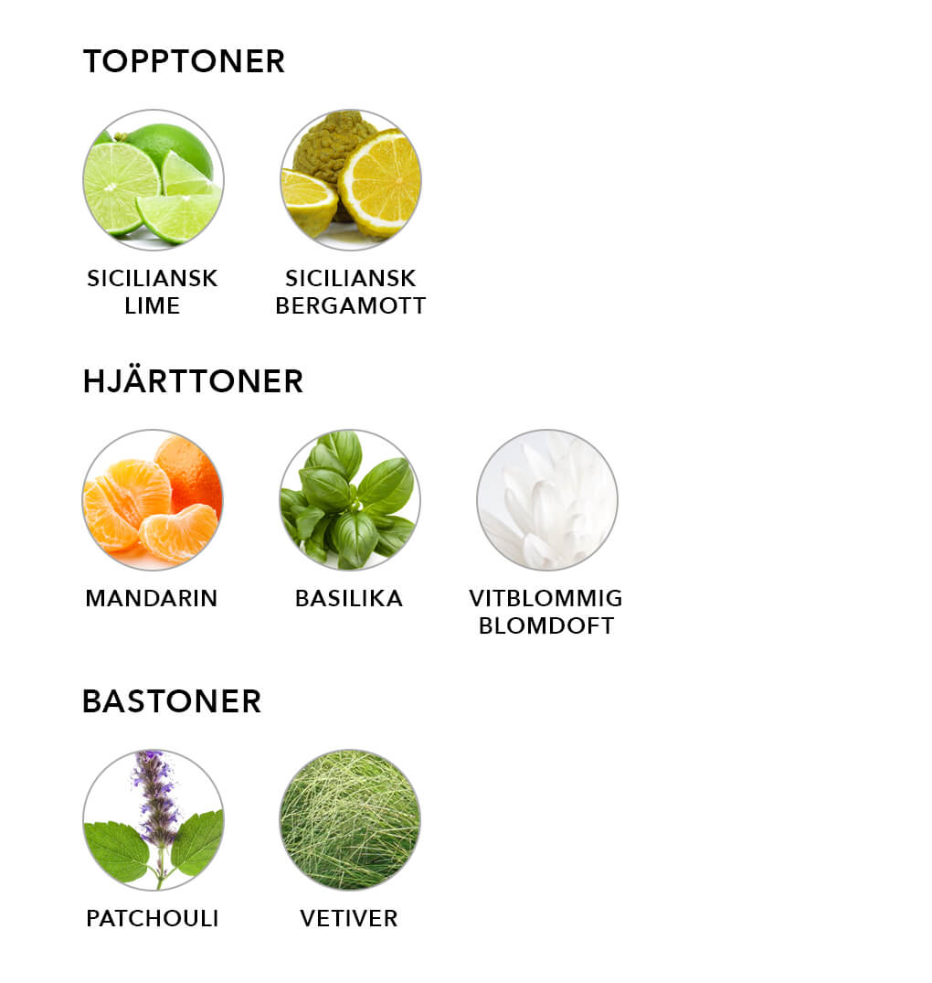 En uppfriskande blandning av aromatisk citrus med saftig mandarin, siciliansk lime och friskheten av basilika ger energi och ett härligt väldoftande rum.